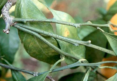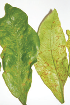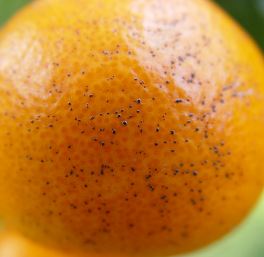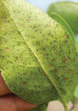 ◦ 잎의 경우 5월 상~중순경 잎이 굳어 지기 전 감염되기 시작해 전형적인 검은 점이 박혀 있지만 심할 경우 잎이 황화되고 심하게 뒤틀리며 낙엽이 되며, 청견, 부지화, 세또까 같은 만감류에서는 잎 표면 흑점형 병반 돌기 정도가 심해 거친 모래가 붙어 있는 것 같은 모양이 되며, 잎의 병반에서는 전염원이 형성되지 못하기 때문에 굳이 방제할 필요가 없음