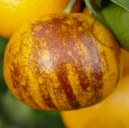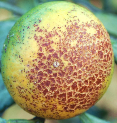 ◦ 병징은 감염 시기나 과실의 상태, 기후조건 등에 따라 매우 다양하게 나타나고 녹응애 피해, 구리제 등에 의한 약해와도 증상이 매우 유사함