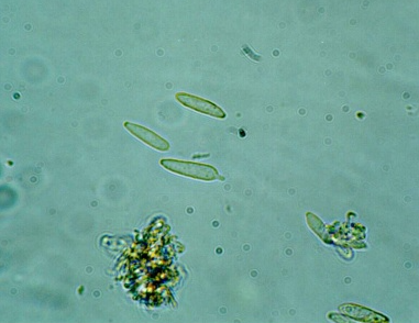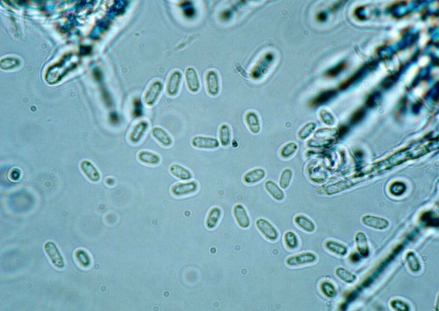 ◦ 분생포자는 투명포자(단세포, 투명한 타원형, 크기 5~8×2~4㎛)와 방추형포자(크기 10~16×4㎛) 두 개의 형태가 존재하며, 방추형포자는 직접 기주식물에 침입하지 못하지만 빗물이나 바람 등에 의해 다른 곳으로 전파되고 그 곳에서 기주에 침입할 수 잇는 투명포자를 출아에 의해 생성함