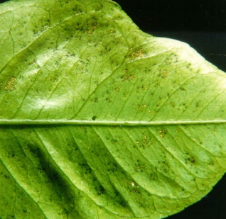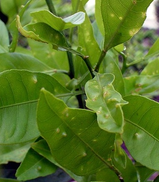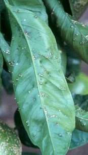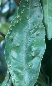 ◦ 잎의 경우 병원균 침입 3일 후 병징이 나타나기 시작하고 초기 증상은 파리똥 같은 작은 반점이 생기고 그 주위는 황화되며, 진전되면 반점이 커지고 돌출해 회갈색이 되고 다습할 경우 연한 황색 또는 분홍색으로 변하며, 심할 경우 잎이나 열매가 기형이 되고 신초에서는 낙엽이 되는 경우도 있음