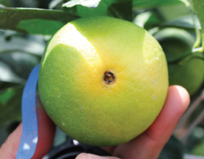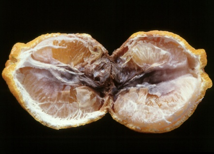 ◦ 이때 모두 배꼽 부위를 중심으로 과실을 쪼개 보면 배꼽부터 중심축이 까맣게 썩어있는 전형적인 온주밀감의 검은썩음병과 같은 특징을 보임