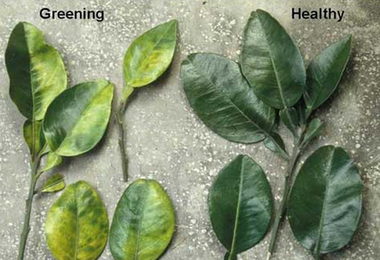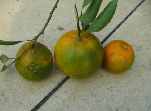 ◦ 감염된 나무는 위축되며, 가지는 마르고 잎은 불규칙한 반점이 나타나며, 아연결핍 증상과 유사한 병징이 나타나는데, 잎맥이 좌우 유사하게 노래지면 아연결핍이고 좌우 상이한 증상이면 황룡병 증상임
