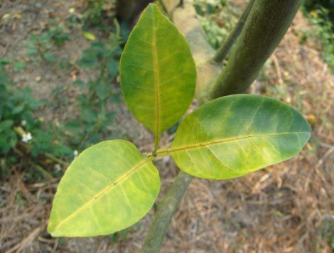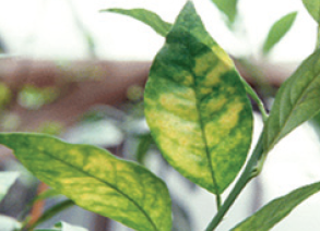 ※ 황룡병에 걸린 잎은 건전한 잎에 비해 전분함량이 높아져 잘라서 요오드에 염색하면 진한 갈색이 되는 것으로 진단이 가능함