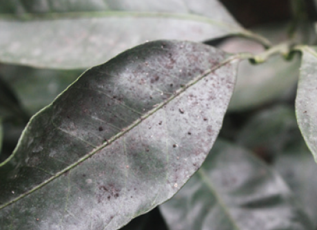 ◦ 잎의 뒷면보다는 앞면에 주로 형성되고 까만 검뎅이가 형성되며, 물로 쉽게 씻겨지지만 때에 따라서는 심할 경우 제거하기가 어려움