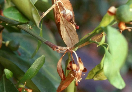 ◦ 가지에서는 초기에 껍질이 갈색의 수침상으로 되고 진전되면 하얀색의 균사체가 출현하고 발병부위 반대편에 연갈색 수지를 발생시키기도 하며, 심하게 감염되어 진전될 경우 발병부위는 회갈색으로 변하고 이병부와 건전부위 사이는 진한 암갈색을 띠고 목질부는 연황색 또는 갈색으로 변하며, 발병부위 위쪽에 있는 잎과 과실은 모두 고사되고 1~3개의 균핵이 형성됨