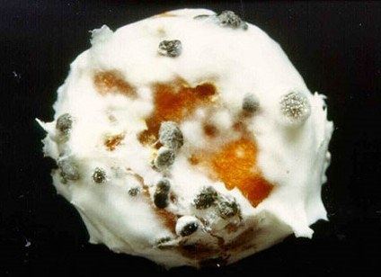 ◦ 저장 중 과실에서도 발생하는데, 초기에는 과피가 연황색 또는 연한 갈색으로 변하기 시작하여 연부되기 시작하고 점차 솜털 같은 흰색의 균사체로 뒤덮이며, 얼마 후 쥐똥 같은 검정색 균핵들이 과실 표면에 형성됨