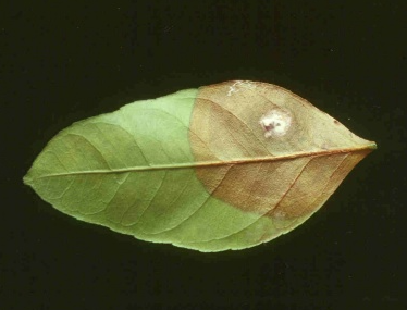 ◦ 잎의 경우 갈색 수침상 병반이 매우 빠르게 전개되고 하얀색 균사체가 나타난 다음 암갈색 균핵이 병반 중심부에 형성되고 대부분 낙엽이 됨
