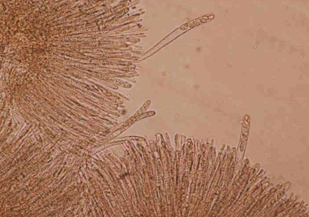 ◦ 분생포자를 생성하지 않고 자낭포자만을 생성하는데, 자낭은 긴 곤봉상, 무색투명에서 담황색, 크기 86.7~137.7×6.1~8.2㎛, 자낭포자는 무색에서 담황색, 방추형, 양쪽 말단에 1~2개의 유구(oil drop), 크기 10.2~12.8×5.1~6.6㎛임