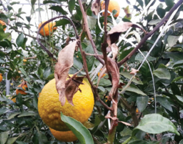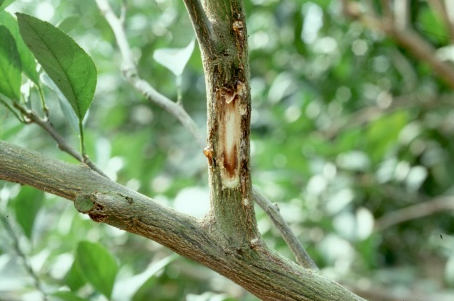 ◦ 병원균은 Diaporthe sp.로 알려져 있지만 수지 증상에서 분리된 균이 검은점무늬병과 매우 흡사하고 과실에 검은점무늬병을 일이키는 것으로 미루어 볼 때 같은 균으로서 Diaporthe citri로 여겨짐