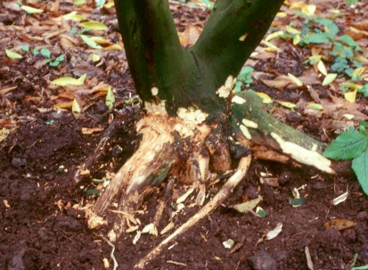 ◦ 진한 갈색으로 변한 지제부에서는 주로 Fusarium solani와 잉크빛을 띄는 부위에서는 Coprinus micaceus가 분리되지만 이들 균들이 단독으로 이런 증상을 유도하는지의 여부는 확실치 않고 단지 여러 환경 요인들과 더불어 이런 증상을 유도하는 것으로 여겨짐