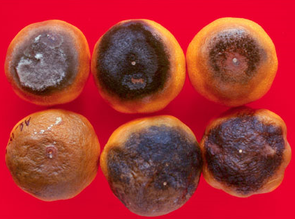 ◦ 처음에 암갈색 또는 흑갈색의 약간 들어간 수침상을 형성하거나 검정색 또는 흑녹색의 솜털과 같은 균사들로 뒤덮인 병반을 형성하며, 이때 과실을 쪼개보면 과실 내부는 부패하여 까만 균사와 포자로 가득 차 있음