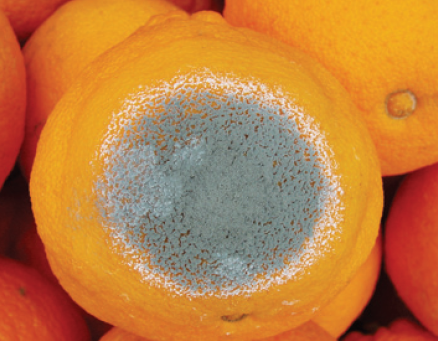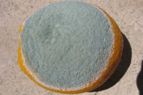 ◦ 초기에 연부로 시작되기는 녹색곰팡이병과 비슷하지만 녹색곰팡이병과 같이 급속하게 연부조직이 확산되지 않으며, 금방 포자가 형성되어 청색의 포자로 뒤덮이고 시간이 지나면서 회청색으로 변함