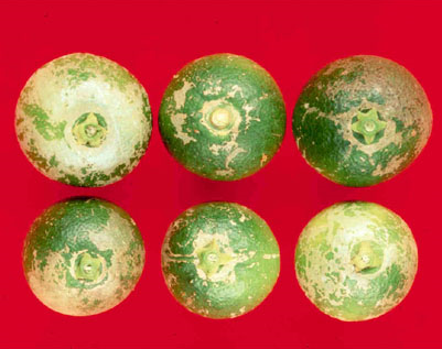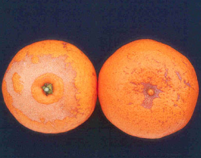 ◦ 노지 감귤에서는 주로 개화기의 자방이나 유과기에 피해를 받는데, 주로 과경부나 과정부를 중심으로 둥글게 은회색 띠가 형성되고 발생밀도가 심한 경우 과실의 가로 중심부까지도 피해 증상이 나타남