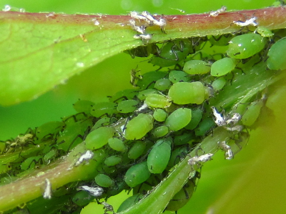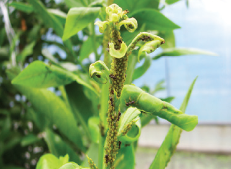 ◦ 새순과 꽃에 기생하는데, 꽃이 피해를 받으면 기형화가 되고 분비물에 의해 그을음병이 생기는데, 밀도가 높을 경우네는 낙화되기도 함