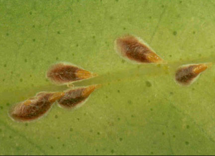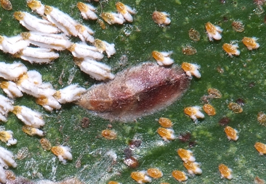 ◦ 수컷은 흰색의 밀납물질로 덮여 있고 길이는 1mm 정도로 가늘고 길며, 수컷 성충은 날개가 있음