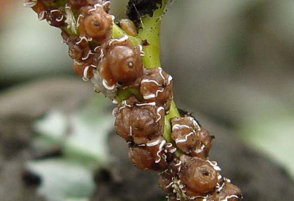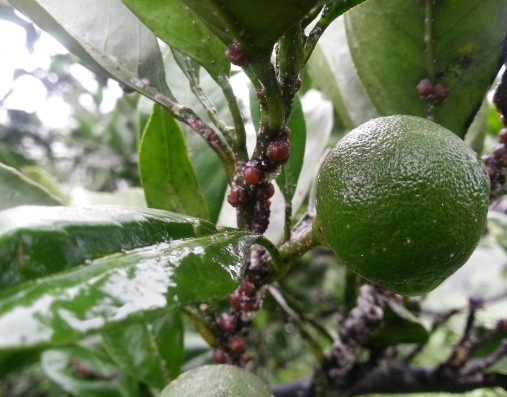 ◦ 가지와 잎에 기생하여 가해하며, 발생밀도가 높을 경우 생육이 불량해지기도 하지만 가장 큰 피해는 배설된 감로로 인한 그을음이 발생하여 과실의 상품가치를 떨어뜨리고 동화작용을 저해하여 생육이 불량해짐