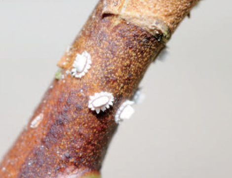 ◦ 정착한 약충은 흡즙을 시작하고 7월 중순 이후 각상 돌기가 형성되어 뿔밀깍지벌레의 특유한 형태가 되고 8월 하순~9월 상순경 성충이 됨