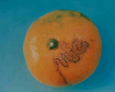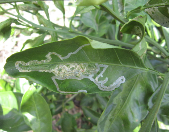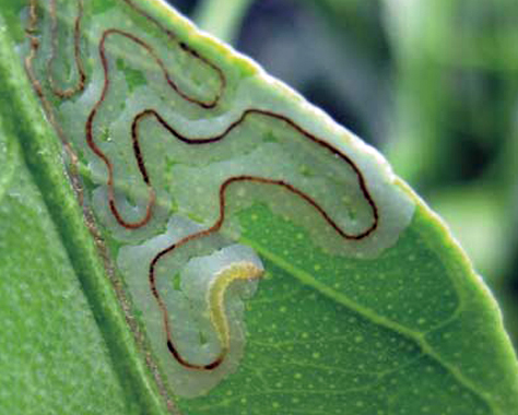 ◦ 유충이 식해한 터널은 가는 곡선을 이루고 피해 받은 잎은 위축되어 기형이 되며, 피해 부위의 상처를 통해 궤양병균이 침입하여 발생하기 쉬운 조건이 됨