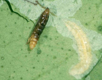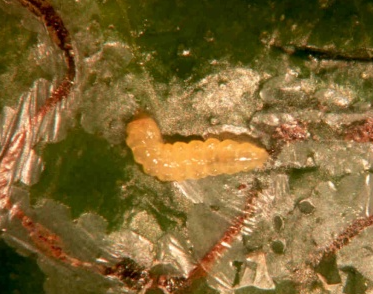 ◦ 유충은 담황색으로 반투명하고 납작하며, 머리는 삼각형이고 다 자란 유충은 길이가 약 3.5~4mm 정도임