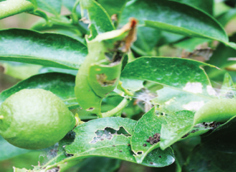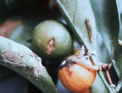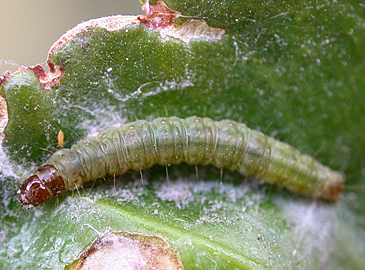 ◦ 유충이 거미줄로 잎을 서로 붙이거나 말아서 집을 만들고 그 속에서 서식하는데, 주로 밤에 나와서 주변의 잎과 과실을 식해함