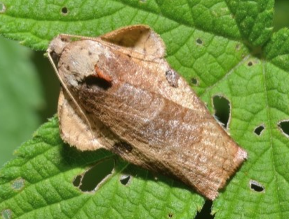◦ 날개편길이 22~30mm로 앞날개의 날개주름이 크고 뚜렷하여 반 달걀 모양이고 그 길이는 날개길의 1/3 정도이며, 앞날개의 바탕색은 짙은 오렌지색에 암갈색이 섞여 있으며, 작은 가로선들이 연결되어 그물 모양을 이룸