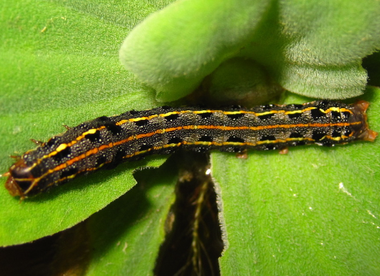 ◦ 어린 유충은 황녹색으로 배 옆면에 백색선이 있고 머리는 흑색이며, 다 자란 유충은 40mm 정도로 일반적으로 암갈색을 띠나 색체 변이가 크고 각 마디의 등면 양쪽에 흑색무늬가 1쌍씩 있으며, 배 옆면에는 암갈색의 선이 있음