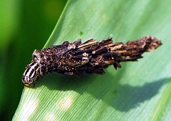 ◦ 월동한 유충은 이듬해 봄 다시 섭식하면서 7령을 경과한 후 5월 하순~6월 상순에 주머니 속에서 번데기가 되고 성충은 6월 상순~7월 중순에 출현함