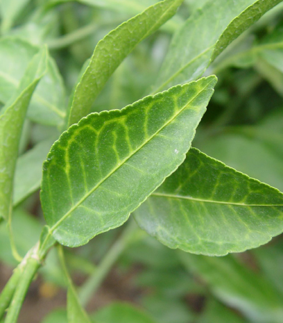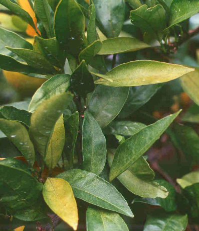 ◦ (결핍) 식물체내 이동이 빠르므로 결핍 증상은 오래된 잎에서 발생하며, 잎의 색이 점차 연한 녹색으로 되고 심해지면 노랗게 변하며, 또한 잎이 가늘어지면서 곧아지는 현상이 나타나고 신초의 자람이 불량해짐