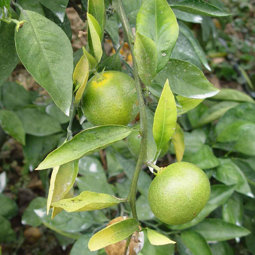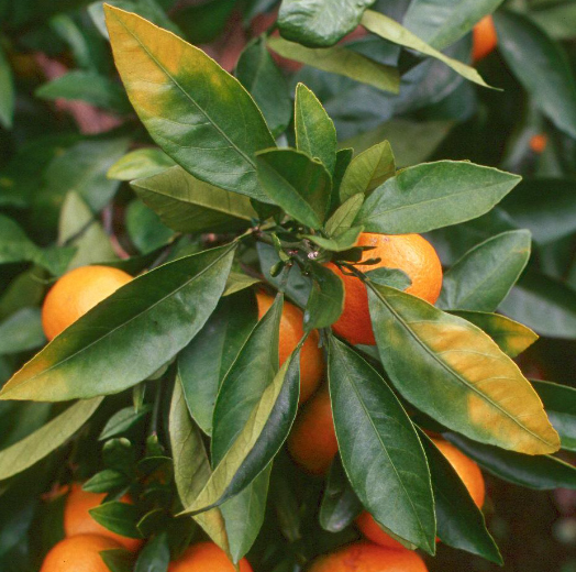 ◦ (결핍) 식물체내 이동이 빠르므로 결핍 증상은 오래된 잎에서 우선 발생하며, 초기에는 잎의 끝이 황화되고 점차 중앙으로 확산되며, 심할 경우 갈색으로 변해 잎이 떨어지고 과실의 비대가 불량하며, 착색이 불량해지고 과실 과정부에 일소과와 비숫하게 타들어가면서 열과가 발생함