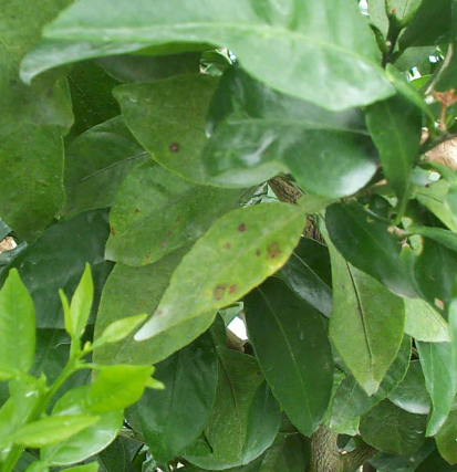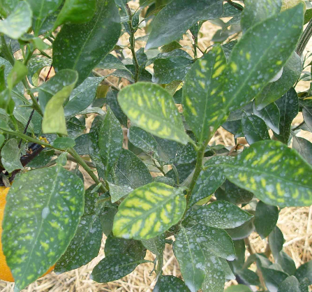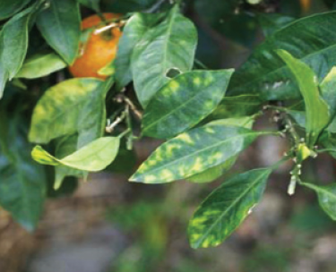 ◦ 결핍 증상이 발생하는 가지는 주로 수세가 약한 아래 가지와 도장지와 같은 강한 여름 순의 윗부분에서 우선적으로 발생하며, 희미했던 증상이 과실 비대가 되면서 점점 진한 노란색 무늬가 선명해짐