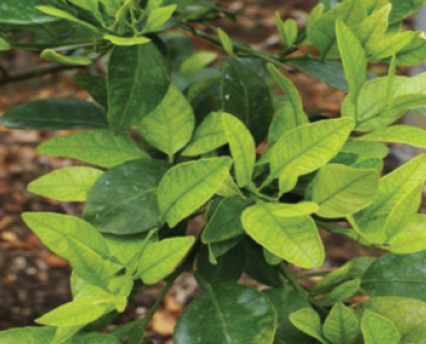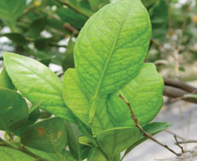 ◦ 철 성분은 토양에 많이 존재하고 있어 결핍 증상은 대체로 잘 나타나지 않지만 어린나무일 때 철과 길항작용을 하는 성분(칼슘, 칼륨, 마그네슘, 아연, 구리 등)을 다량 시용할 경우 결핍 증상이 나타남