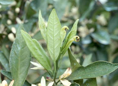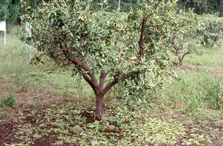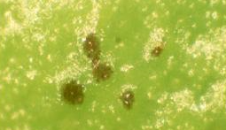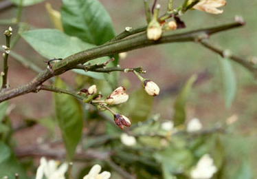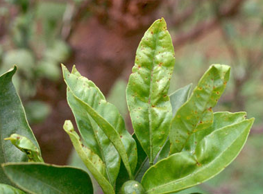 ◦ 피해 증상은 크게 3가지로 나타날 수 있는데, 첫째는 구엽이 낙엽되고 둘째는 새순이 타버리는 경우이며, 세번째는 닢이나 열매에 검은점무늬병과 유사한 흑점이 형성되는 것임