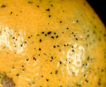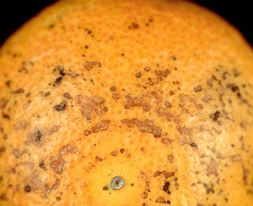 ◦ (흑점형 반점) 낙화기 무렵이나 여름철 고온기에 구리제를 사용하였을 경우 검은점무늬병과 매우 유사한 흑점형 반점이 생길 수 있으며, 유과기 때 피해를 받은 경우 흑점 주위의 조직이 약간 함몰되고 여름철 피해를 받은 경우 검은점무늬병에 비해 흑점이 약간 더 돌출되고 붉은 기운이 있으며, 기름에 절인 듯한 증상을 보임