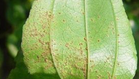 ◦ 잎의 표면에 갈색의 소형 반점이 형성되고 점차 커지면서 잎 뒷면에는 융기된 갈색점(하포자층)이 형성되며, 심하면 잎 전체가 고사하며 낙엽됨