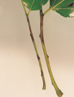 ◦ 잎줄기에는 처음 멍들은 것 같은 불명확한 반점이 나타나고 점차 진전되면서 과일이나 잎자루로 확대되며, 심하면 잎줄기 전체가 고사함