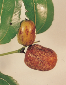 ◦ 과실에는 처음 명확하지 않은 적갈색의 반점이 나타나고 진전되면 과일 전체가 적갈색으로 변하며, 주로 꼭지부분부터 시작되는 수가 많고 발병 후 대부분 조기 낙과하거나 미이라처럼 매달려 있음