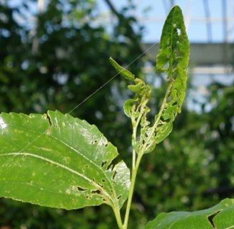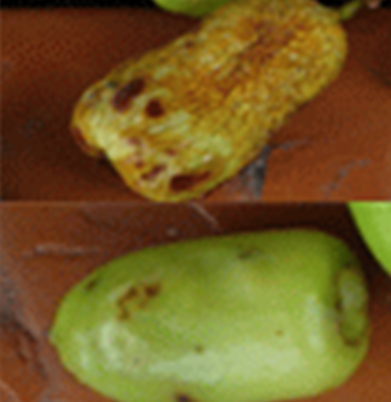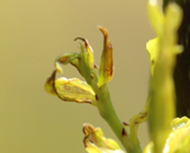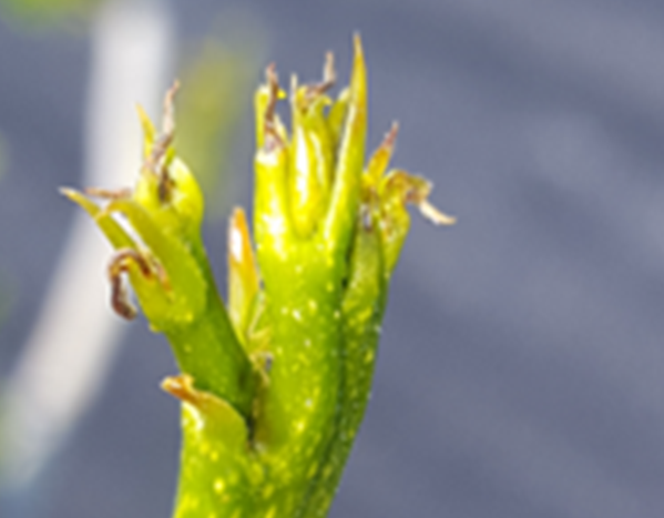 ◦ 대추 어린 순이 잎으로 전개되지 못하거나 잎에 갈색 반점이 생기고 구멍이 나타나며, 잎 가장자리가 갈변되어 잎이 오그라듦