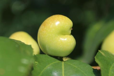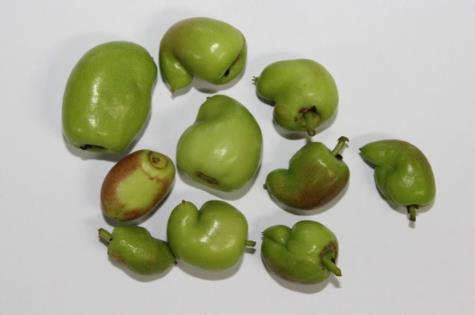 ◦ 산란관을 이용해 과실 내부에 산란을 하고 부화한 유충이 어린 과실을 가해하여 발육장애로 한쪽으로 휘어지는 기형과가 발생하며, 주로 후기에 착과되는 어린 과실에서 발생함