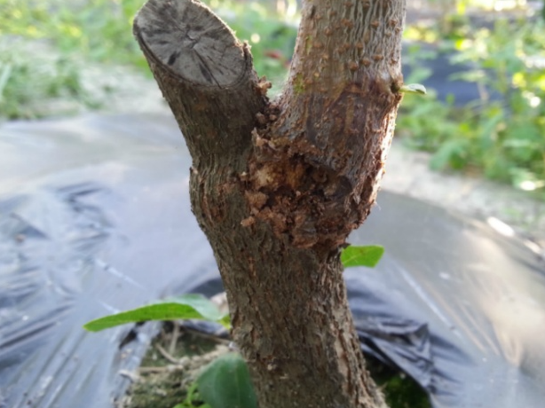 ◦ 성충이 산란하지 못하도록 접촉성 살충제 등을 혼용한 백도제(또는 수성페인트)를 가해부 줄기에 발라 방제
