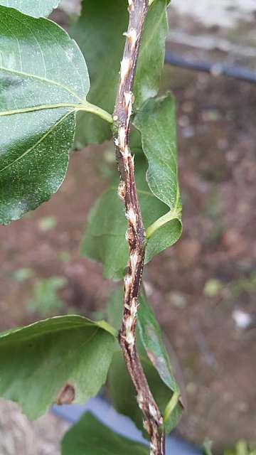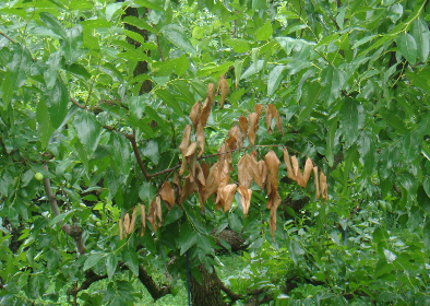 ◦ 1~2년생 가지에 성충이 나선형으로 산란을 하여 그 윗부분의 신초가 고사하는 피해를 줌