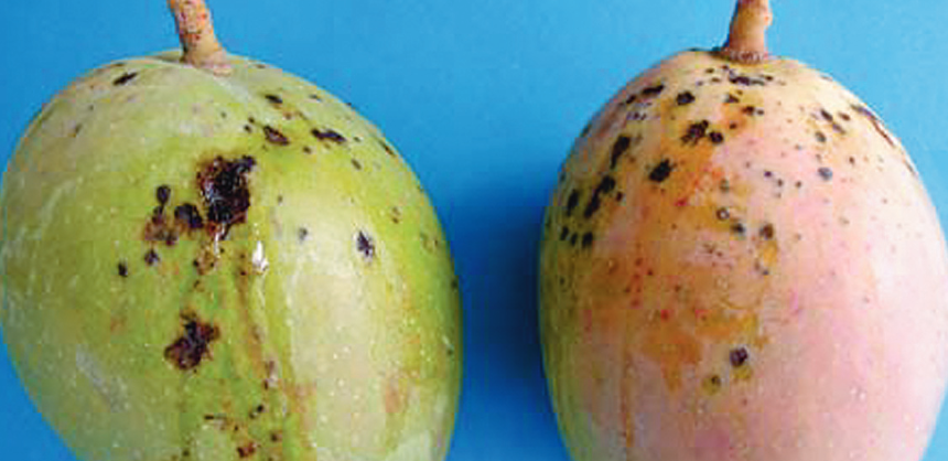 ◦ 과실에서는 과피에 10~15mm의 불규칙한 검은 반점이 생기고 진행하면 움푹 패거나 균열을 일으킴