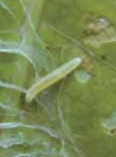 ◦ 유충의 머리는 편평하고 짙은 노란색이며, 몸통은 녹색임