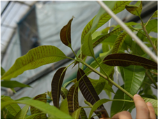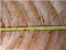 ◦ 총채벌레 피해 증상과 유사하나 총채벌레 피해 증상은 엽맥이 검게 변하지만 차먼지 응애 피해는 엽맥에 피해가 거의 나타나지 않음