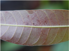 ◦ 잎에서만 피해가 유발되는데, 초기에는 엽맥 주위가 검붉게 변하고 후기에는 엽맥보다는 엽육이 전체적으로 붉게 변함