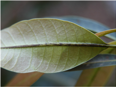 ◦ 잎을 가해할 경우 초기에 엽맥이 부분적으로 검게 변하고 발생이 지속될 경우 엽맥과 잎 가장자리 부위가 검게 나타남