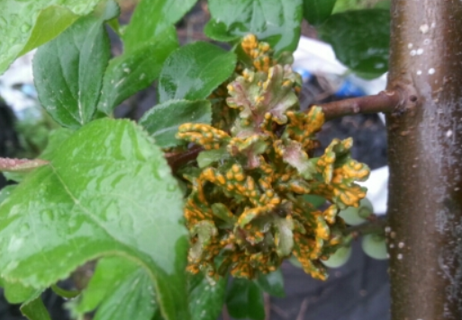 ◦ 등록된 약제가 없으나 포도 녹병에 등록된 약제 중 매실의 검은별무늬병에 등록된 약제(에이플 등)를 이용하여 방제하며, 낙엽기에 석회보르도액을 살포하고 동계에는 석회유황합제를 살포함
