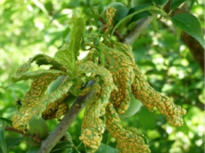 ◦ 그후 여러 모양으로 부풀고 이것이 등황색으로 변하며, 이 부풀어진 표면이 찢어지고 등황색의 분말(녹포자)이 비산하여 눈은 전부 병변 고사함