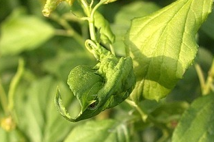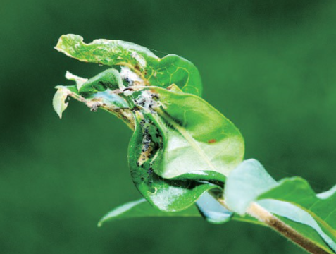 ◦ 유충이 어린 가지의 잎을 여러 장 묶거나 말고 그 속에서 잎을 갉아 먹으며, 주로 잎 뒷면의 표피를 남기고 갉아 먹어 피해 잎은 갈색으로 변함