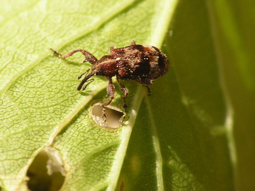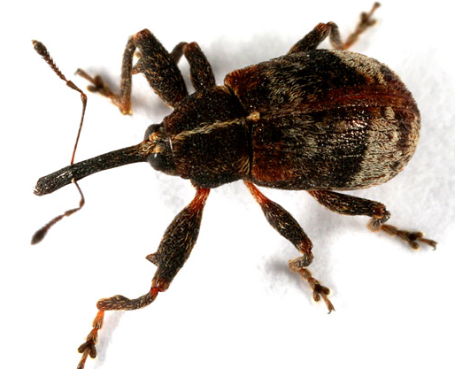 ◦ 성충은 몸길이 3~4mm로 어두운 갈색~적갈색이고 양 가장자리와 머리, 더듬이 부위가 더 진하며, 주둥이는 길게 신장되었음