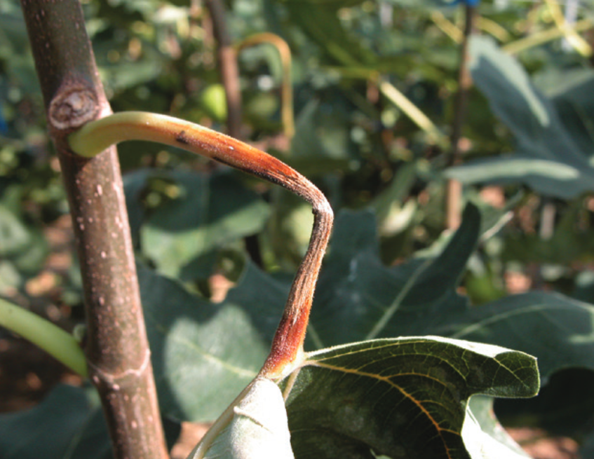 ◦ 처음에 잎자루에 반점이 생기면서 점차 위아래로 확대되고 갈변되며, 심해지면 잎의 무게를 견디지 못해 아래로 꺾이게 되고 잎은 마르고 부패되어 낙엽됨